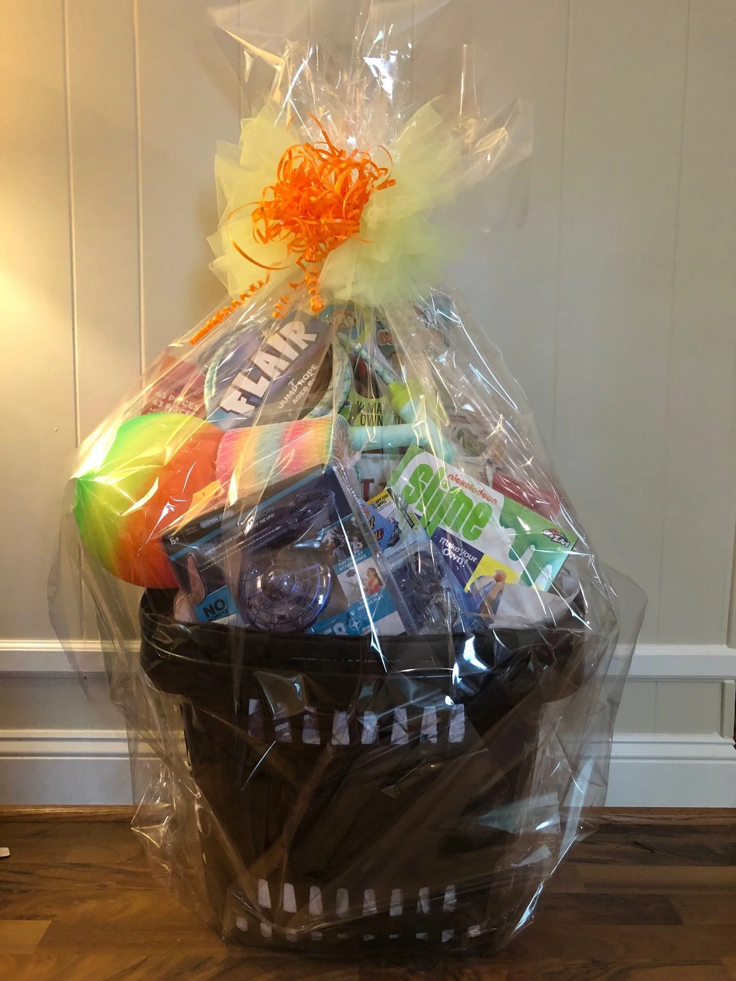 Toys for everyone! This multi-purpose rolling basket includes a large box of Magformers, Hover Star drone, Galactic Slime, Bop-it, giant Slinky, Beyblade, stickers, bouncy ball, jump rope, and Ticket to Ride game.